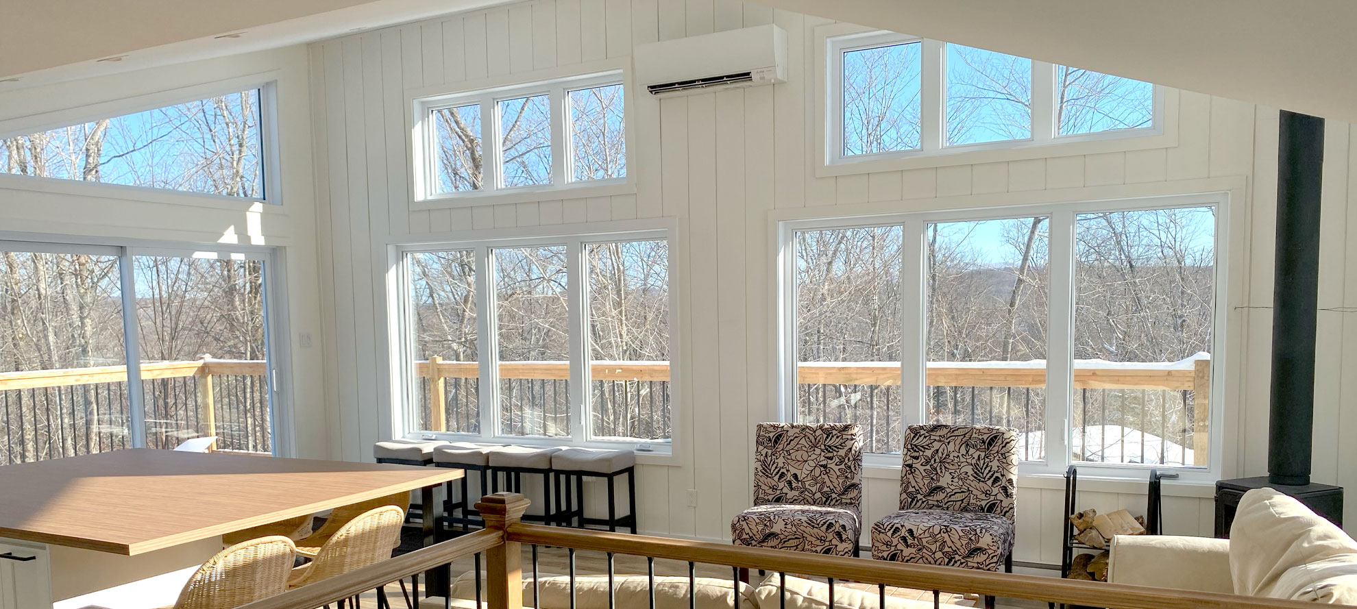 The chalet for rent in Baskatong can accommodate up to 10 people. It has 3 bedrooms with 4 Queen beds and 1 King bed, with a bathroom and a shower room. A Murphy bed is available in the living room (Queen bed)